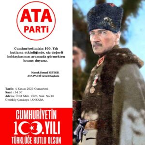 ATA PARTİ, Cumhuriyetin 100. yıl kutlama etkinliği düzenlemektedir. Bütün vatandaşlar davetlidir. TARİH: 04 Kasım 2023 SAAT: 14.00...