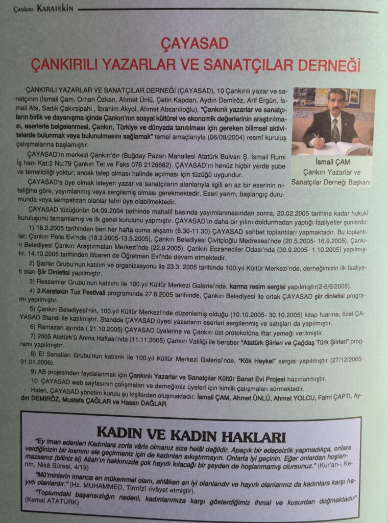 ÇAYASAD eda_admin 20 Şubat 2026 1 min read Spread the love ÇAYASAD Karatekin Dergisi, Çankırı Karatekin Kültür Yardımlaşma ve Dayanışma Derneği Yayını,Yıl: 1, Sayı: 1, Ocak-Şubat-Mart 2006, s. 26 20.02.2026 İsmail ÇAM E. ÇAYASAD Bşk / İstiklal Yolu Derneği Bşk. Continue Reading Previous: ZAFER PARTİSİ SİVİL TOPLUM İLİŞKİLERİ HIZLA GELİŞİYOR!Next: YAPRAKLI FESTİVALİ Bir cevap yazın Cevabı iptal etE-posta hesabınız yayımlanmayacak. Gerekli alanlar * ile işaretlenmişlerdirYorum * İsim E-posta İnternet sitesi Bir dahaki sefere yorum yaptığımda kullanılmak üzere adımı, e-posta adresimi ve web site adresimi bu tarayıcıya kaydet. Δ İlgili Yazılar KADINLAR, SAYGIYA LÂYIKTIR! 1 min read KADINLAR, SAYGIYA LÂYIKTIR! 8 Mart 2026 8 MART KADINLAR GÜNÜ 1 min read 8 MART KADINLAR GÜNÜ 8 Mart 2026 8 MART DÜNYA KADINLAR GÜNÜ 5 min read 8 MART DÜNYA KADINLAR GÜNÜ 8 Mart 2026
