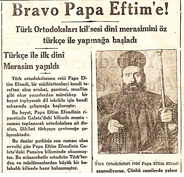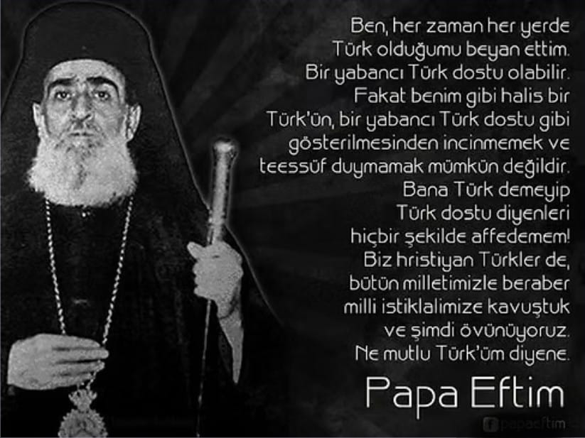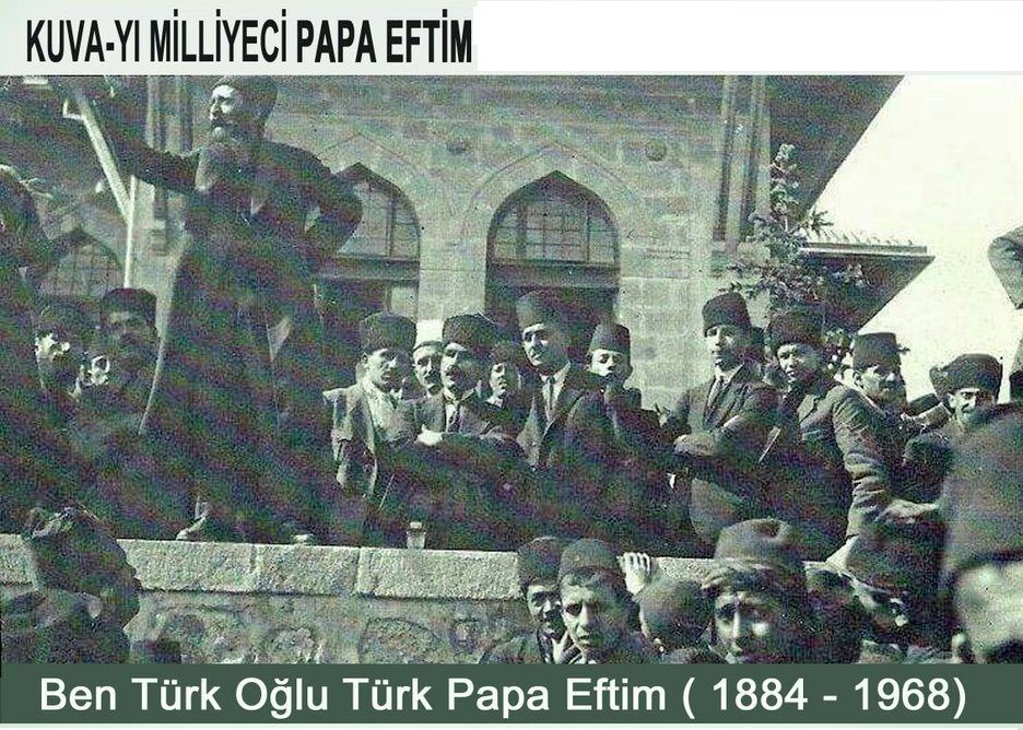 Papa Eftim, Türk tarihinin en ilginç, en cesur ve en destansı kişilerinden biridir. Bir papaz olmasına rağmen “Türk oğlu Türk” diyerek Fener Rum Patrikhanesi’ne kafa tutmuş, Millî Mücadele’de cephe gerisinde değil, bizzat fikir ve manevi cephede savaşmış, Atatürk’ün “Baba Eftim” diye hitap ettiği, “Bize bir ordu kadar yardım etti.” dediği adamdır.