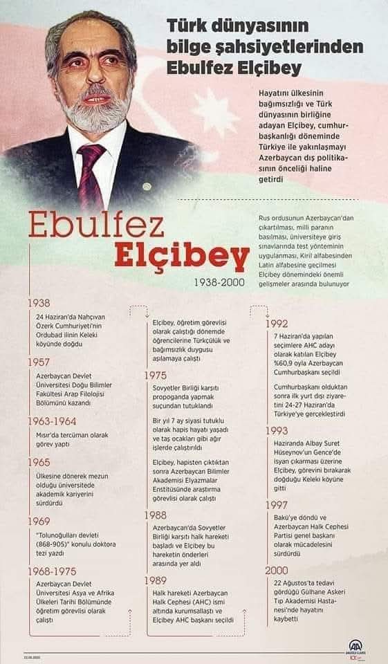 Ebulfez Elçibey (gerçek adıyla Ebulfez Kadir Güloğlu Aliyev), 24 Haziran 1938’de Nahçıvan Özerk Cumhuriyeti’nin Ordubad iline bağlı Keleki köyünde doğmuş, 22 Ağustos 2000’de Ankara’da vefat etmiş, Azerbaycan’ın bağımsızlık mücadelesinde önemli bir figür olan akademisyen, siyasetçi ve Azerbaycan’ın ikinci cumhurbaşkanıdır. Türk dünyasının birliği ve Azerbaycan’ın bağımsızlığı için verdiği mücadeleyle tanınan Elçibey, aynı zamanda Azerbaycan Halk Cephesi Partisi’nin kurucusu ve ilk genel başkanıdır. Pan-Türkist ve anti-komünist görüşleriyle bilinen Elçibey, Azerbaycan’ın Sovyet sonrası dönemde demokratik yollarla seçilen ilk cumhurbaşkanı olmuştur.